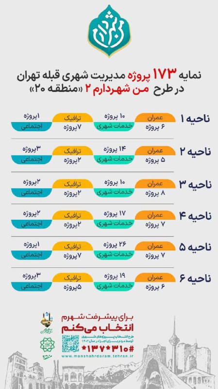 نمایه ۱۷۳ پروژه مدیذیت شهری قبله تهران در طرح من شهردارم ۲ منطقه۲٠