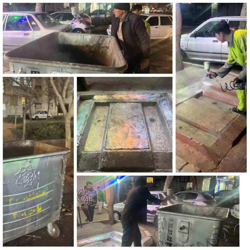 قاسمی افزود، با توجه به اینکه خیابان فدائیان اسلام مسیر پرتردد شهروندان است، تعداد ۵۰ عدد از مخازن و زیر مخازنی رنگ نقره ایی انجام شد.