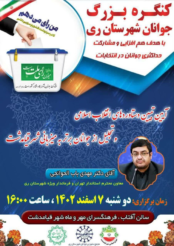 سومین کنگره بزرگ مجمع مشورتی جوانان شهرستان ری با سخنرانی معاون محترم استاندار تهران و فرماندار ویژه شهرستان ری فردا به میزبانی بخش خاوران در شهر قیامدشت برگزار می گردد