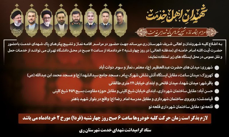 با اطلاع کلیه شهروندان و اهالی شریف شهرستان ری می رساند جهت حضور در مراسم اقامه نماز و تشییع پیکرهای پاک شهدای خدمت باحضور حضرت آیت الله امام خامنه ای مدظله العالی در روز چهارشنبه ۲ اردیبهشت ماه از ساعت ۷ صبح در محل دانشگاه تهران می توانند از خدمات حمل و نقل عمومی در محل ایستگاه های زیر استفاده نمایند: