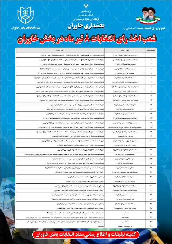 اخبار بخش اخبار کوتاه اخبار کوتاه شهرستان June 28, 2024 خبرنگار پایگاه خبری مهر خاوران لیست شعب اخذ رای انتخابات ریاست جمهوری در بخش خاوران لطفا برای دیگران ارسال نمایید «کمیته تبلیغات و اطلاع رسانی ستاد انتخابات بخش خاوران»