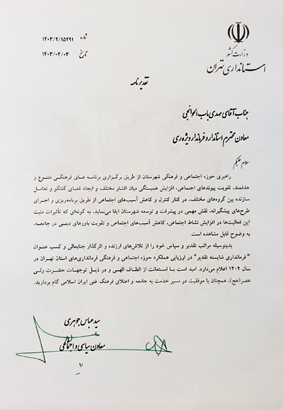 کسب رتبه برتر استان تهران توسط اداره اجتماعی و فرهنگی فرمانداری ویژه شهرستان ری