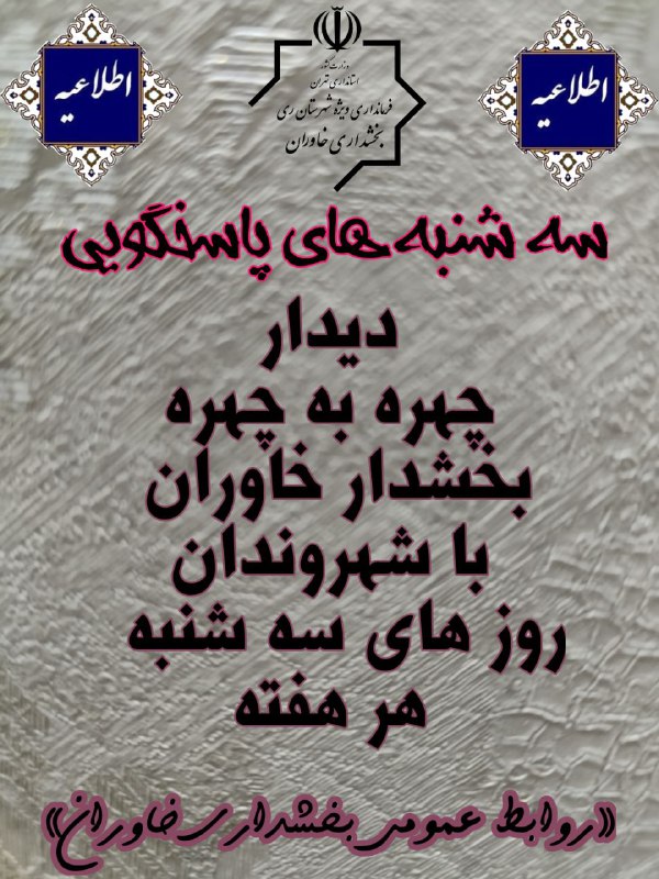 لازم به یادآوری است؛ جلسات ملاقات مردمی بخشدار خاوران با شهروندان ودهوندان، روزهای سه شنبه هر هفته از ساعت ٨ صبح الی ١٢ ظهر در محل بخشداری خاوران برگزار میشود که شهروندان میتوانند به منظور مطرح نمودن درخواست های خود در ساعت مقرر، با مراجعه به بخشداری، مسائل و مشکلات خود را بیان نمایند.