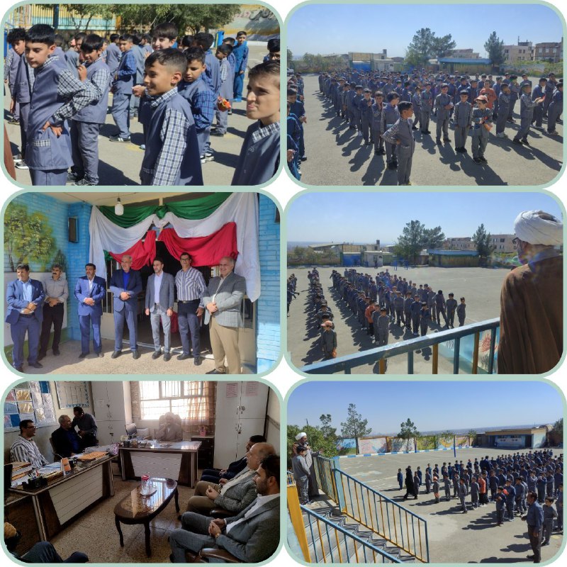 آیین بازگشایی مدارس آموزشی ظهر امروز با حضور حجت السلام والمسلمین طزری امام جمعه بخش خاوران، اکبری بخشدار خاوران،صالحی پارسا رییس شورای اسلامی بخش خاوران،دهیار،رییس و اعضا شورای اسلامی روستای چهلقز در دبستان پسرانه هدایت روستای چهلقز
