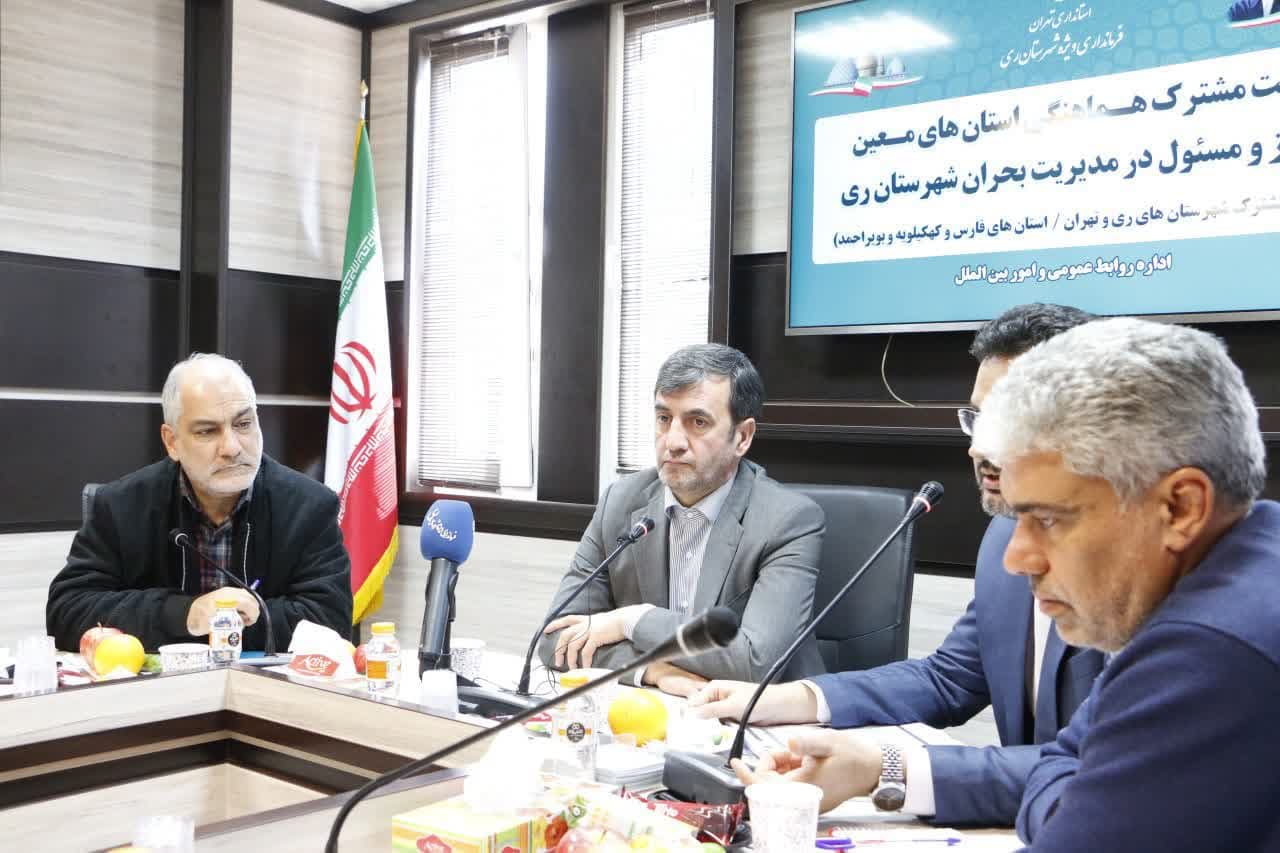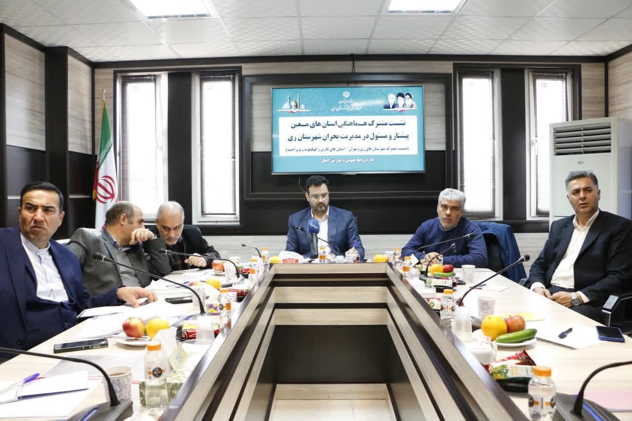 به گزارش مهر خاوران، در راستای آمادگی هرچه بیشتر دستگاه های متولی در امر مدیریت بحران و افزایش سطح هماهنگی میان استانی و شهرستانی، نشست مشترک هماهنگی استان های معین، پیشتاز و مسئول در مدیریت بحران به ریاست بیژن سلیمانپور معاون استاندار تهران و فرماندار ویژه شهرستان ری در محل سالن جلسات شهدای مدافع حرم ساختمان فرمانداری برگزار شد.