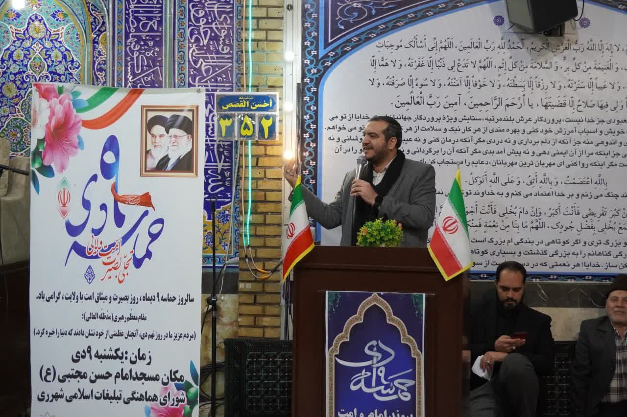 سلیمانپور افزود: ۹ دی تجلی وفاق، همدلی و همگرایی ملت در برابر فتنه های دشمنان قسم خورده نظام و انقلاب است. مردم بزرگ ایران در این روز فارغ از هرگونه اختلافات و تفاوت در دیدگاه ها، با لبیک به ندای مقام معظم رهبری به میدان آمدند و تمامی توطئه های دشمنان و نقشه های شوم آنها را نقش بر آب کردند.