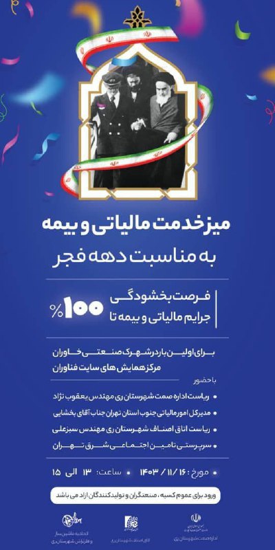 فرصتی برای بخشودگی جرائم مالیاتی و بیمه اصناف بابرپایی میز خدمت به مناسبت دهه فجر با حضور رئیس اداره صمت و اتاق اصناف شهرری ، مدیر کل امور مالیاتی جنوب استان تهران و سرپرستی تامین اجتماعی شرق تهران