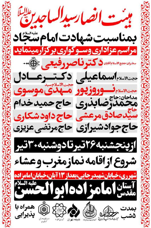 هیئت انصارسیدالساجدین(ع) و آستان مقدس امامزاده ابوالحسن(ع) بمناسبت دهه سوم محرم و ایام شهادت_امام_سجاد_ع مراسم عزاداری برگزار مینماید